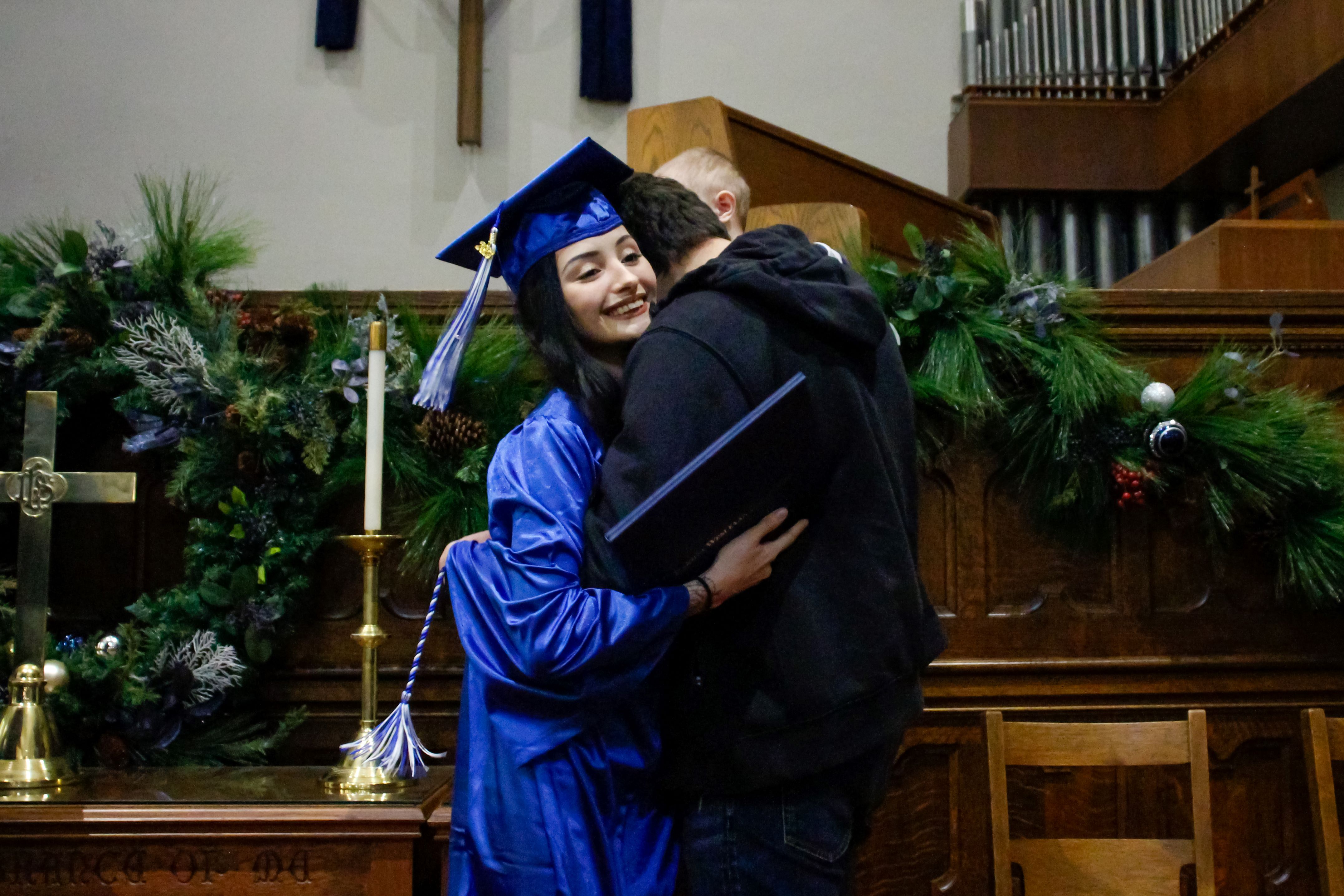 De Alba receiving her diploma and a hug at the 2023 DWU Learn & Earn Commencement ceremony